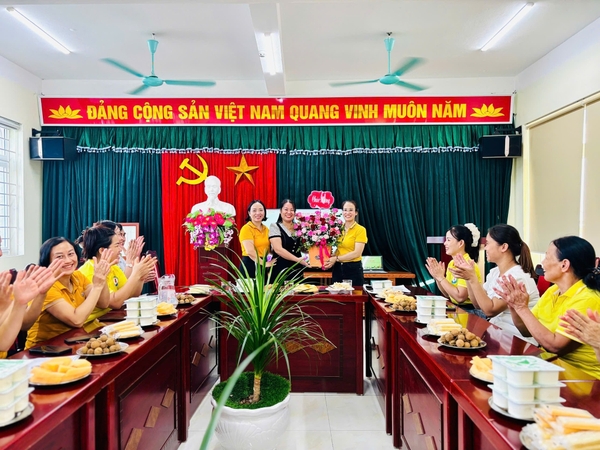 Đại diện Cấp ủy chi bộ, Ban giám hiệu nhà trường tặng hoa chúc mừng đồng chí Trần Thị Dạ Thi nhận cương vị Hiệu trưởng trường mầm non Hồng Thái.