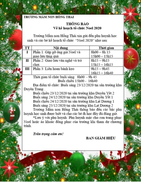 THÔNG BÁO LỊCH TỔ CHỨC NOEL 2020