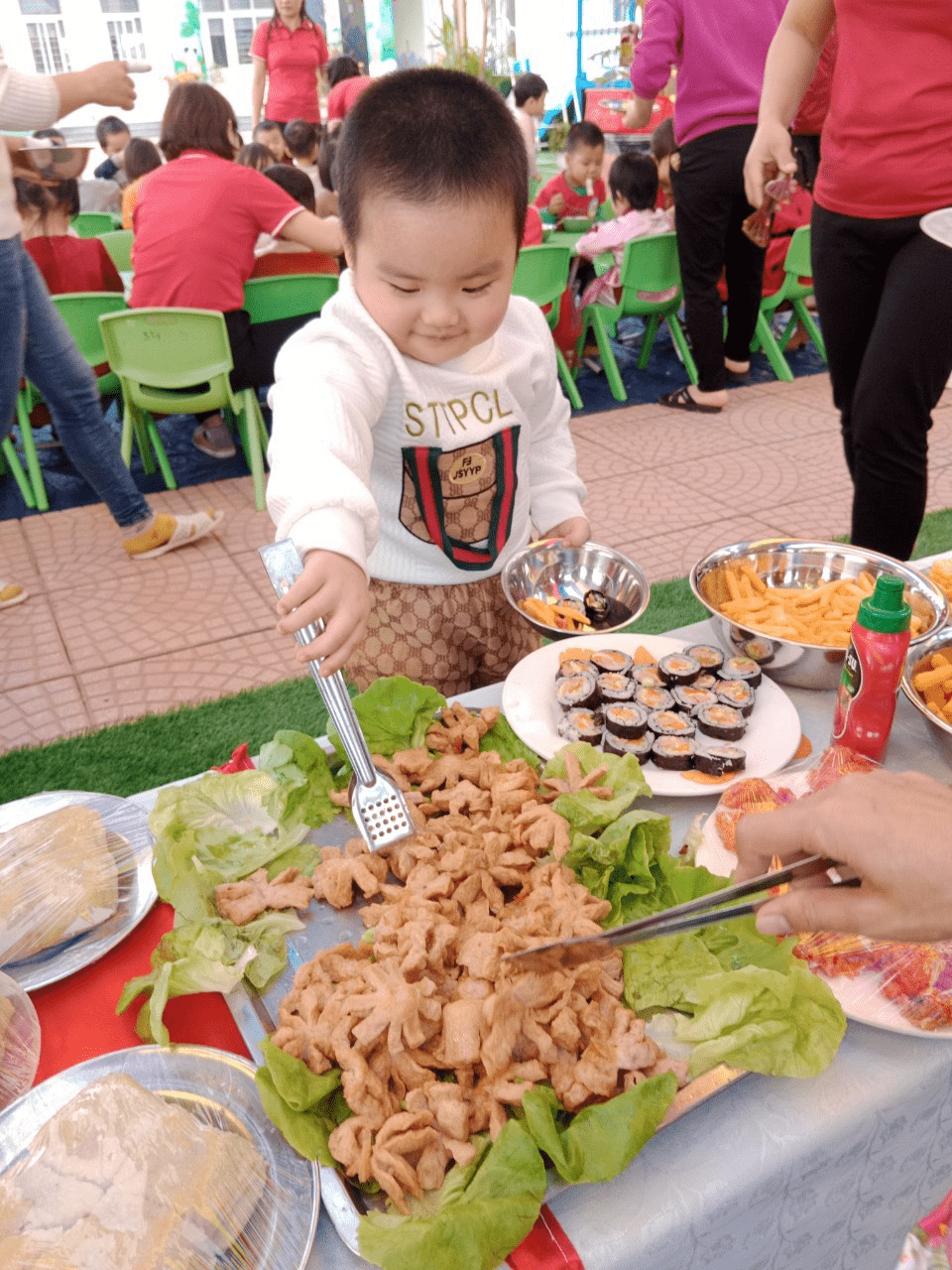 Khi được tham gia bữa tiệc, các bé tỏ ra vô cùng thích thú với những món ăn được trình bày hấp dẫn, được trang trí đẹp mắt. Các bé được cô giáo giới thiệu thực đơn, hướng dẫn xếp hàng chờ tới lượt lấy đồ ăn, chọn thức ăn mình thích và được cô giáo trợ giúp gắp những món khó. Các cô còn dạy trẻ không lấy nhiều một loại thức ăn, lấy mỗi món một chút và ăn hết phần thức ăn mình đã lấy, không để thức ăn thừa. Khi cầm khay thức ăn trên tay, di chuyển chậm, cẩn thận để không va chạm vào bạn khác. Sau khi lấy thức ăn xong, các con trở về chỗ ngồi của mình và thưởng thức những món ăn ngon, hấp dẫn cùng với các bạn.