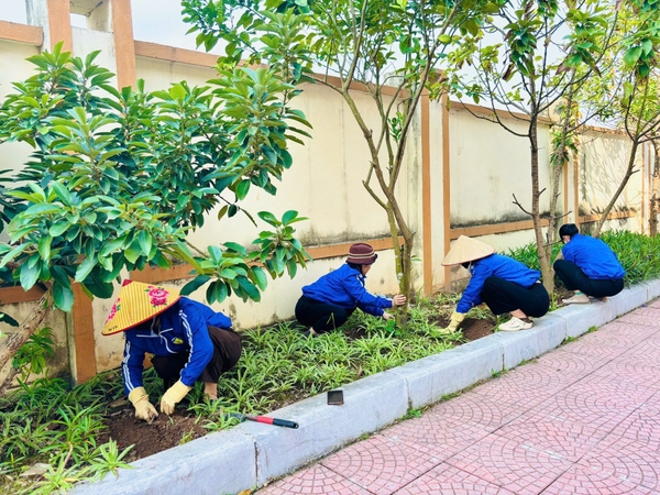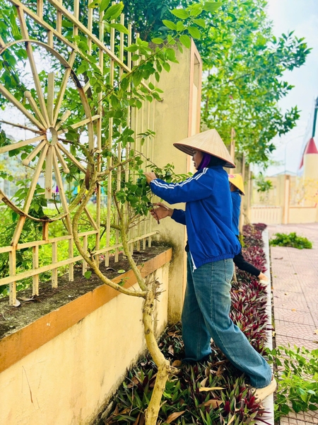 Chăm sóc cây xanh: Cắt tỉa cây cảnh, dọn cỏ tại các bồn hoa, tạo không gian xuân rực rỡ.