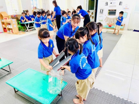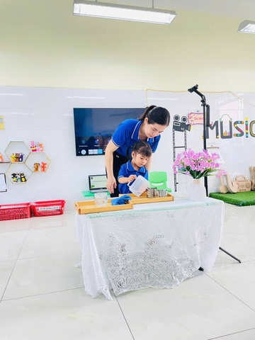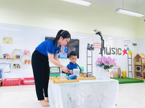 Ở nhóm trẻ 25-36 tháng B, cô giáo Giang Thị Diệu Thủy và cô Nguyễn Thị Chiến tổ chức hoạt động “Bé tập rót nước bằng hai tay” ứng dụng công nghệ phản chiếu hình ảnh hết sức thú vị. Dưới sự hướng dẫn ân cần, nhẹ nhàng của các cô, những bàn tay nhỏ xinh cẩn thận nâng bình, cầm chai và rót từng dòng nước trong veo. Hoạt động tưởng chừng đơn giản ấy lại mang ý nghĩa sâu sắc, giúp trẻ rèn luyện vận động tinh, phát triển khả năng phối hợp tay - mắt, tăng cường sự tập trung và kiên trì, đồng thời hình thành tính tự lập và cẩn thận trong từng hành động nhỏ.